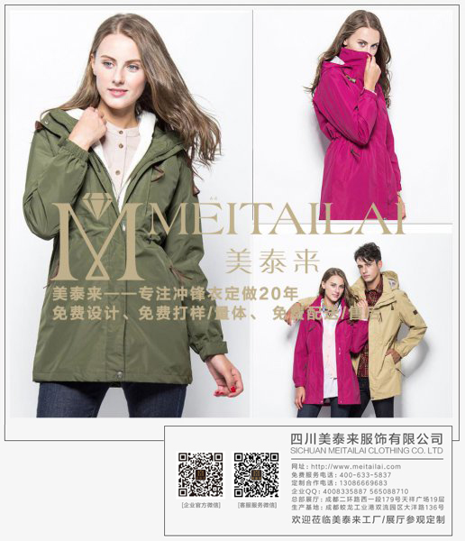 冲锋衣_四川冲锋衣_成都美泰来冲锋衣_四川成都美泰来冲锋衣厂,美泰来服饰,四川大型服装企业,AAA级诚信企业,企业通过ISO9001质量体系认证,成都美泰来服饰有限公司专注服装定制20年,值得您的托付。随着社会经济发展,企业活动也愈来愈多,企事业单位,学校,团体冬季会进行各项的户外活动,如爬山,户外拓展,旅游等,使用到羽绒服,冲锋衣,防寒服的频率会越来越高,统一企业形象必然要统一服装并希望将企业团体logo等绣在衣服上,美泰来针对团体客户提供成都美泰来冲锋衣定做,给您个性定制大批量冲锋衣,只要您想要的款式,美泰来都能给您设计打样,还可以提供哥伦比亚、北面、始祖鸟、狼爪品牌冲锋衣批发团购,全面满足您的需求。